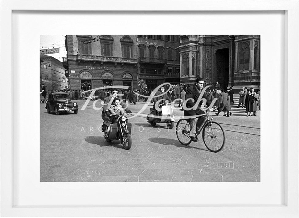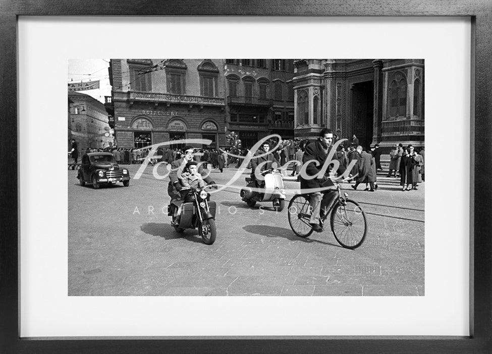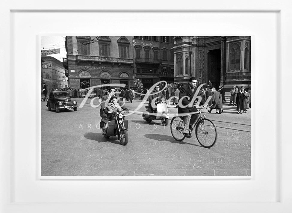 Stampa fotografica Fine Art su carta di alta qualità - Scatto originale di alcuni mezzi di trasporto in transito da Piazza Duomo negli anni Cinquanta, proveniente dall'Archivio storico Foto Locchi.